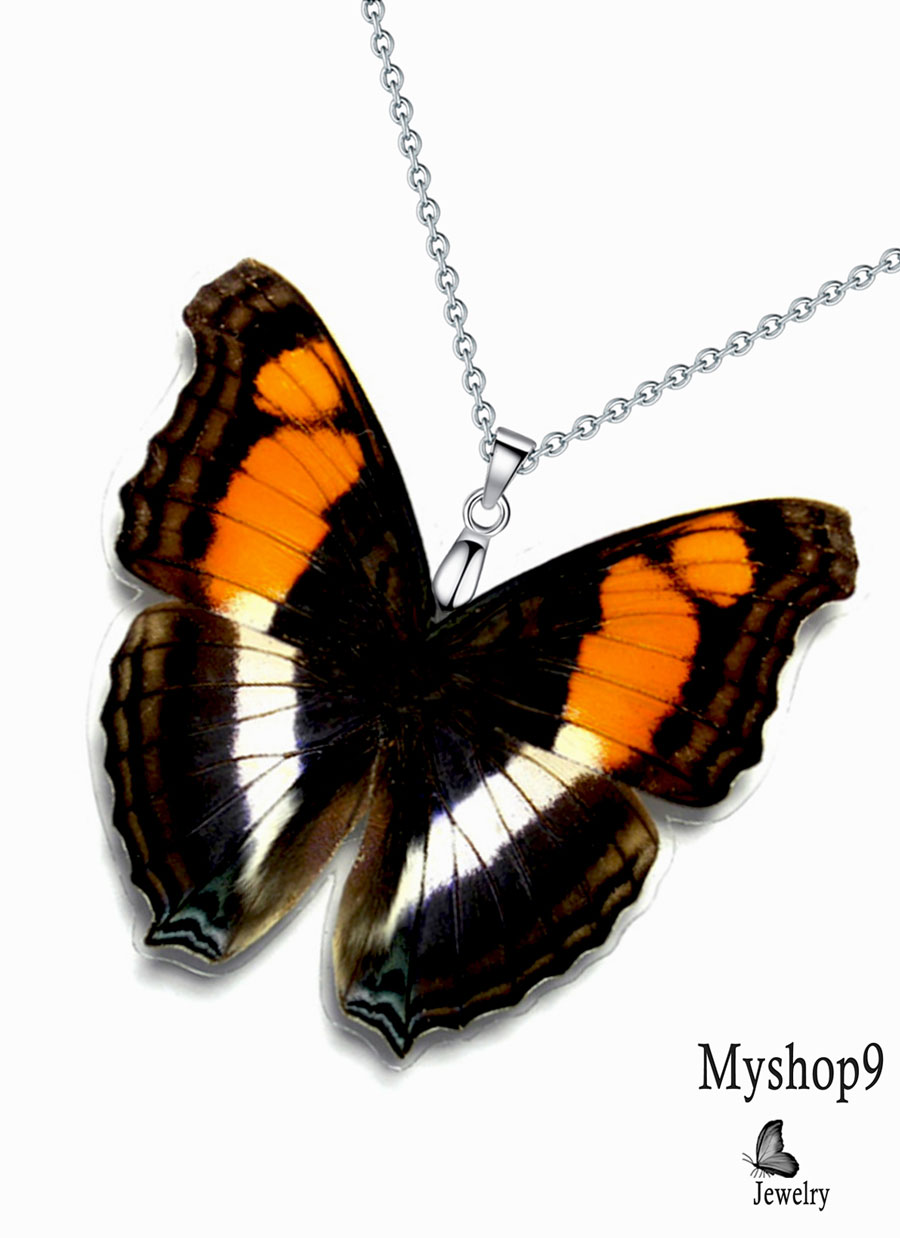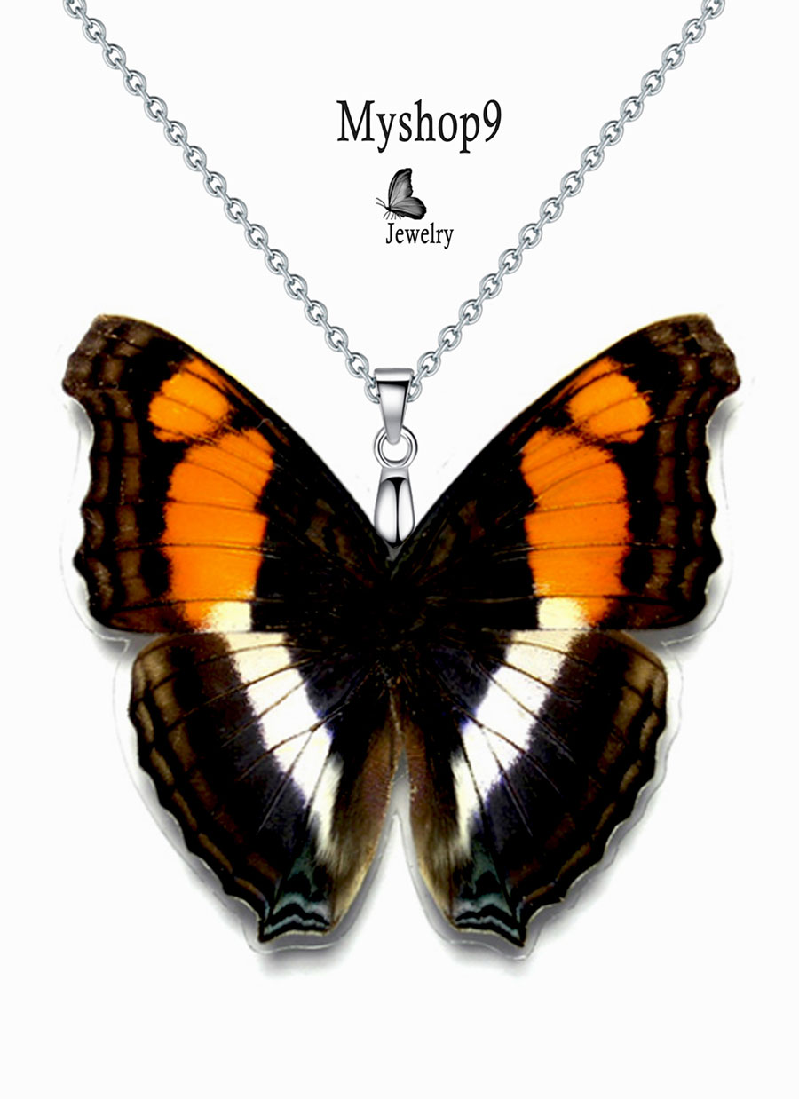Ethical handmade necklace with real Doxocopa Laura butterfly wing. Natural material jewelry with stainless steel chain and eco gift packaging.