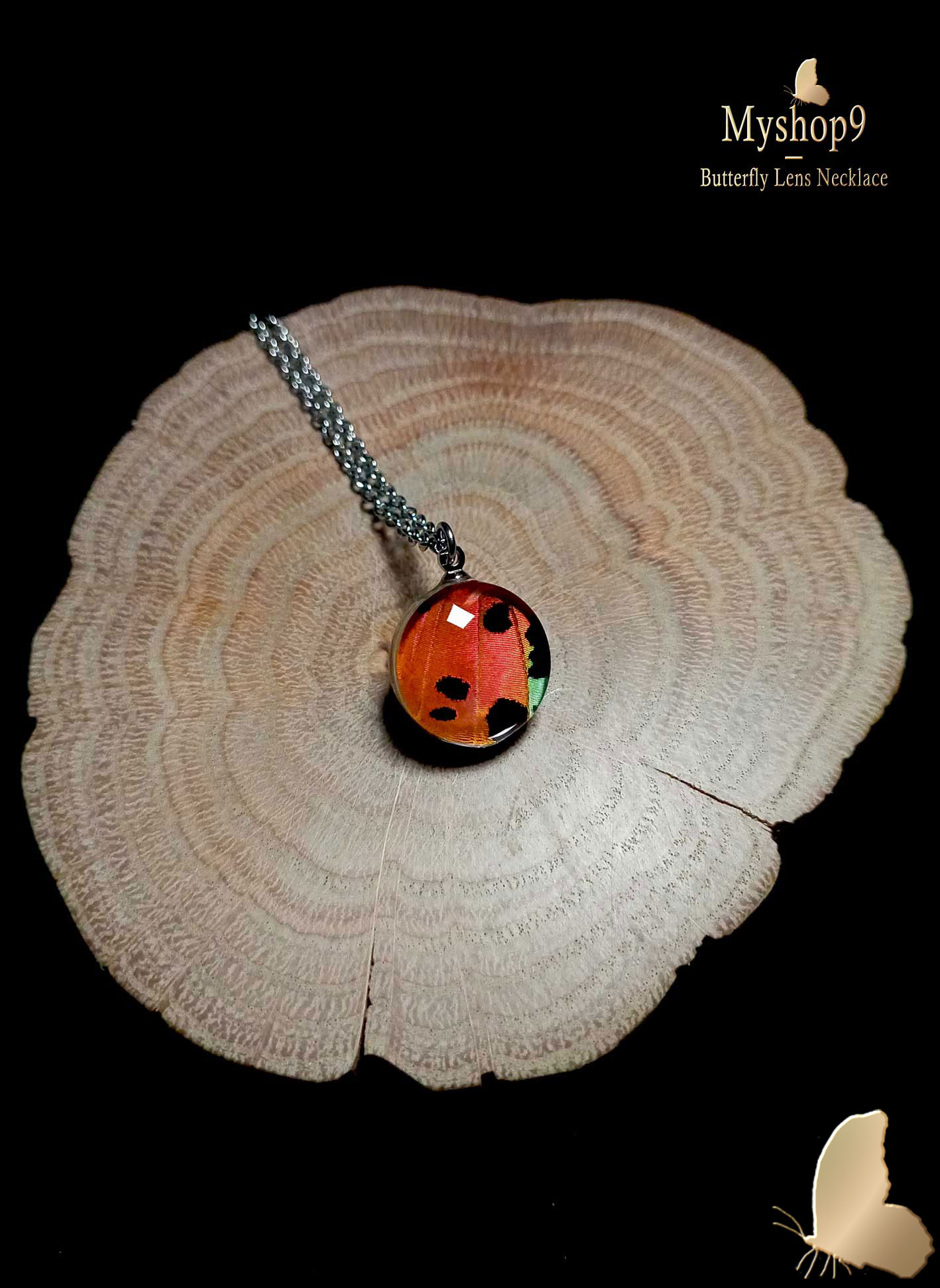 Celebrate the vibrant beauty of nature with the Real Sunset Butterfly Wing Pendant. Featuring a genuine Urania ripheus (Madagascan sunset moth) wing selected for its brilliant red, orange, and green patterns, this pendant is carefully preserved under a 16mm glass lens to enhance its iridescent brilliance.